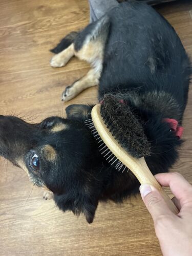 I love that this is double sided, and we use it for dolls rather than our short haired dogs. It’s wire like a wig brush, and soft on the other side for a smoothing paddle brush.